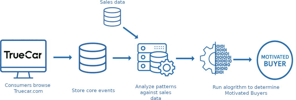One thing TrueCar has a lot of is data: consumer browsing data, market data, and most importantly, sales data. This is what allows TrueCar to do this lead prediction when our competitors can’t. We have a robust sales matching pipeline to know which cars actually sell. We can then correlate sales to specific consumer actions. We currently measure 40+ consumer actions against sales data to train our AI prediction engine.
